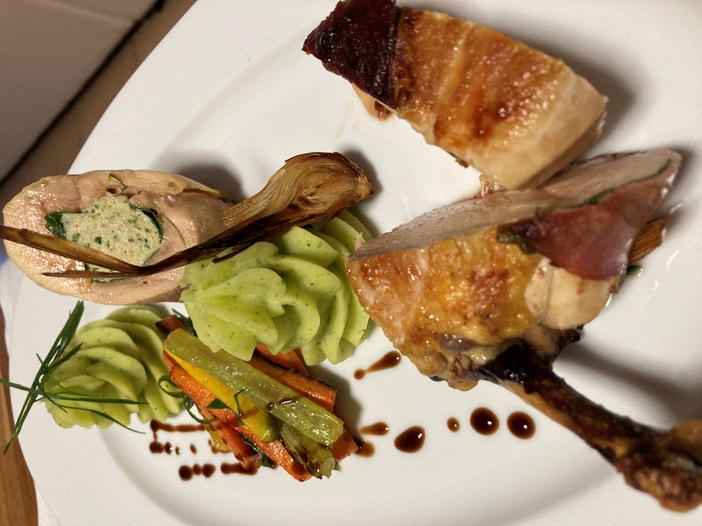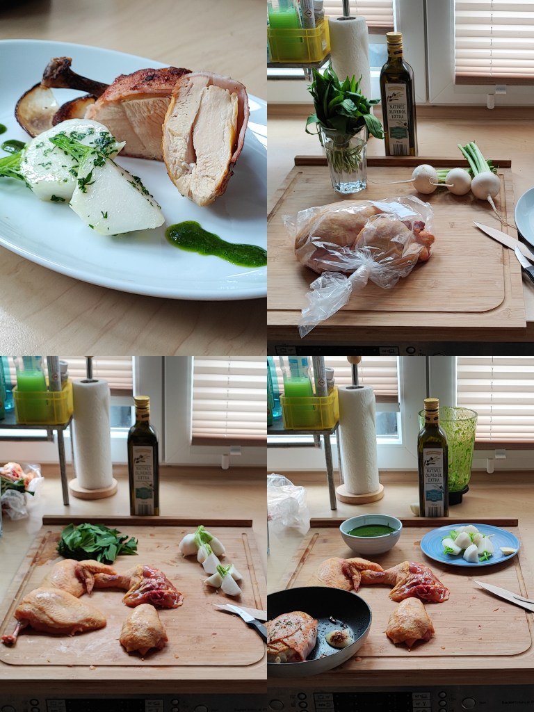 Maishuhn Brust, frischer Bärlauch und kleine Rüben.