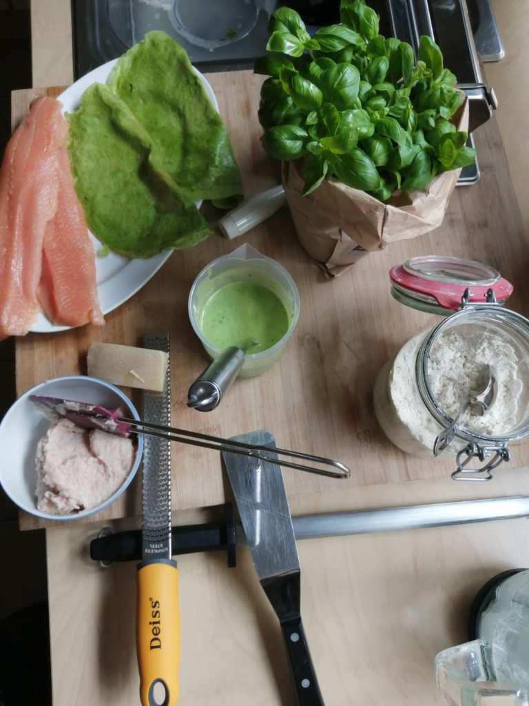und bei dem Fisch im Kräuterpfannkuchen hier die Schritte zum grünen Crepes